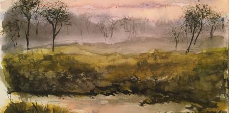 Titulo: Paisagem de Outono, uma aguarela com 21x15 cm, pintada em 2020.