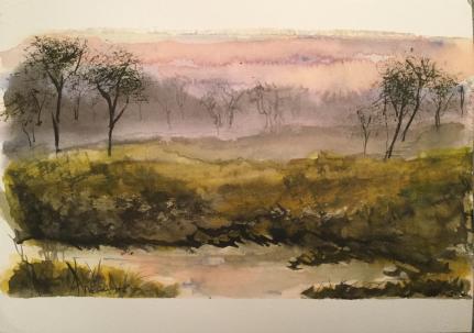 Titulo: Paisagem de Outono, uma aguarela com 21x15 cm, pintada em 2020.