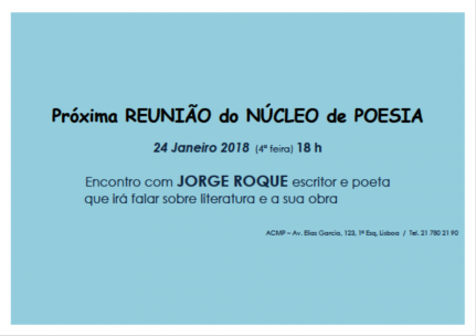 Reunião Núcleo de Poesia 24 de Janeiro de 2018 (4ªa Feira) 18h ACMP - Av. Elias Garcia 123, 1ºEsq 1050-098 Lisboa