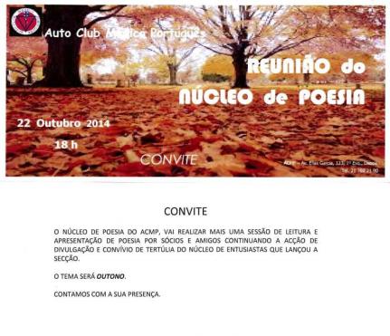 Reunião do Núcleo de Poesia Convite Reunião do Núcleo de Poesia 22 de Outubro 2014 às 18h. O núcleo de poesia do ACMP, vai realizar mais uma sessão de leitura e apresentação de poesia por sócios e amigos continuando a acção de divulgação e convívio de tertúlia do núcleo de entusiastas que lançou a secção. O tema será Outono.